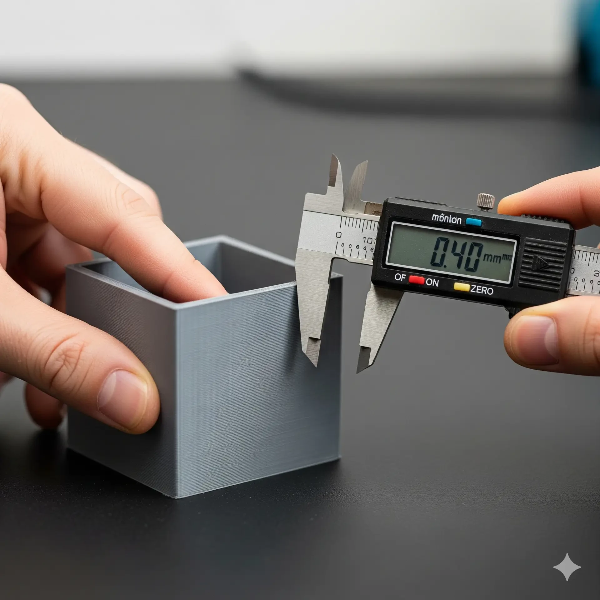 - Meet de wanddikte van de geprinte kubus met een schuifmaat.