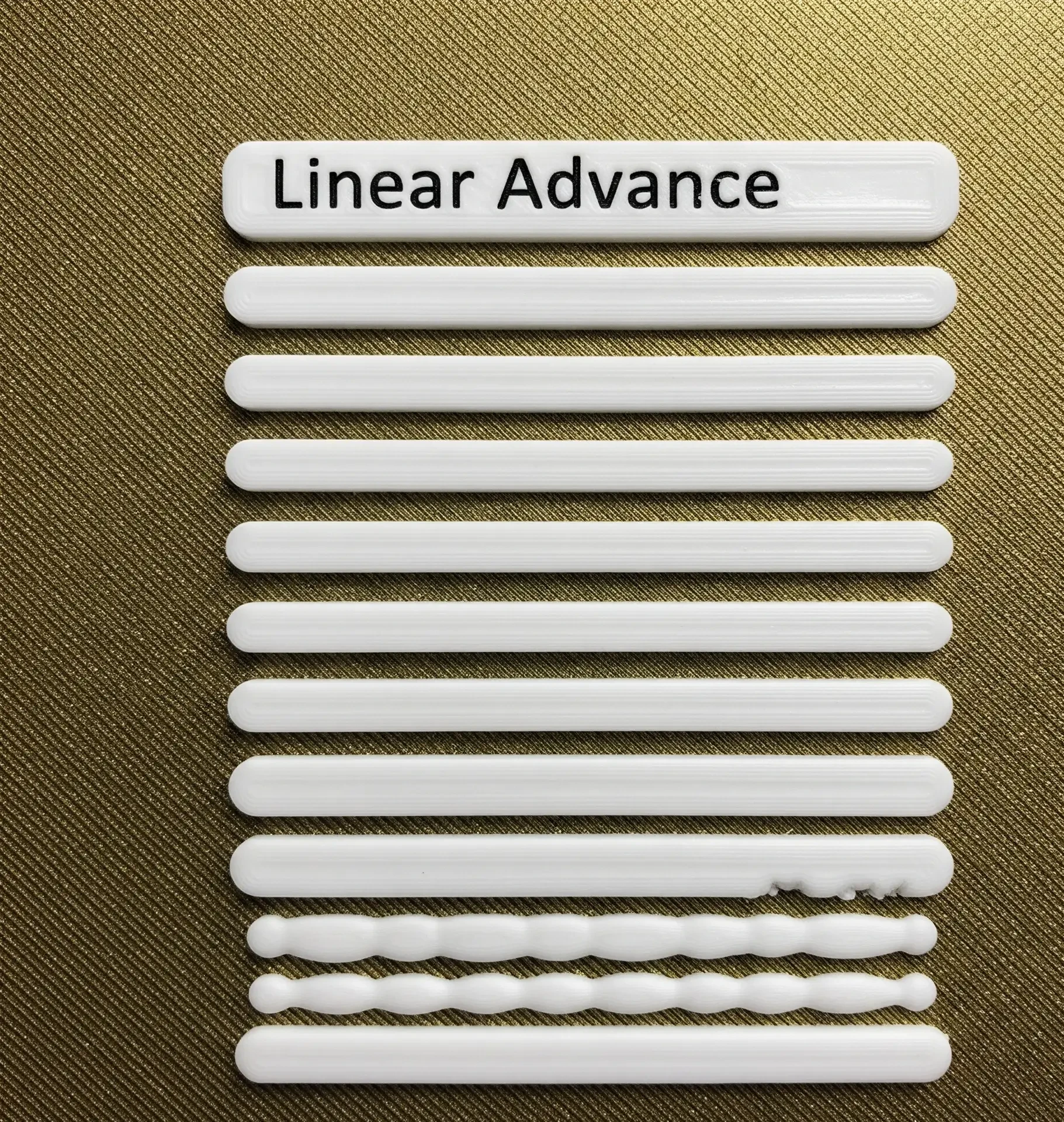 - Genereer een specifiek testpatroon (vaak een lijn die geleidelijk versnelt en vertraagt, of een serie korte lijnen) met een specifieke K-factor (Linear Advance) of Pressure Advance waarde.